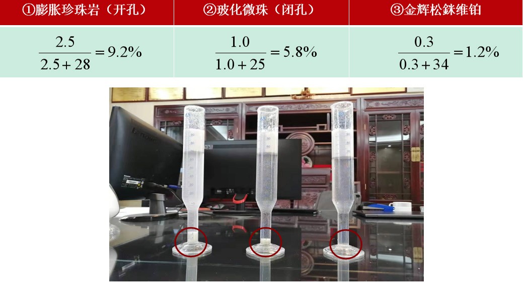 ——开孔珍珠岩/玻化微珠/金辉松銤维铂沉降率对比试验数据(20min沉降)——